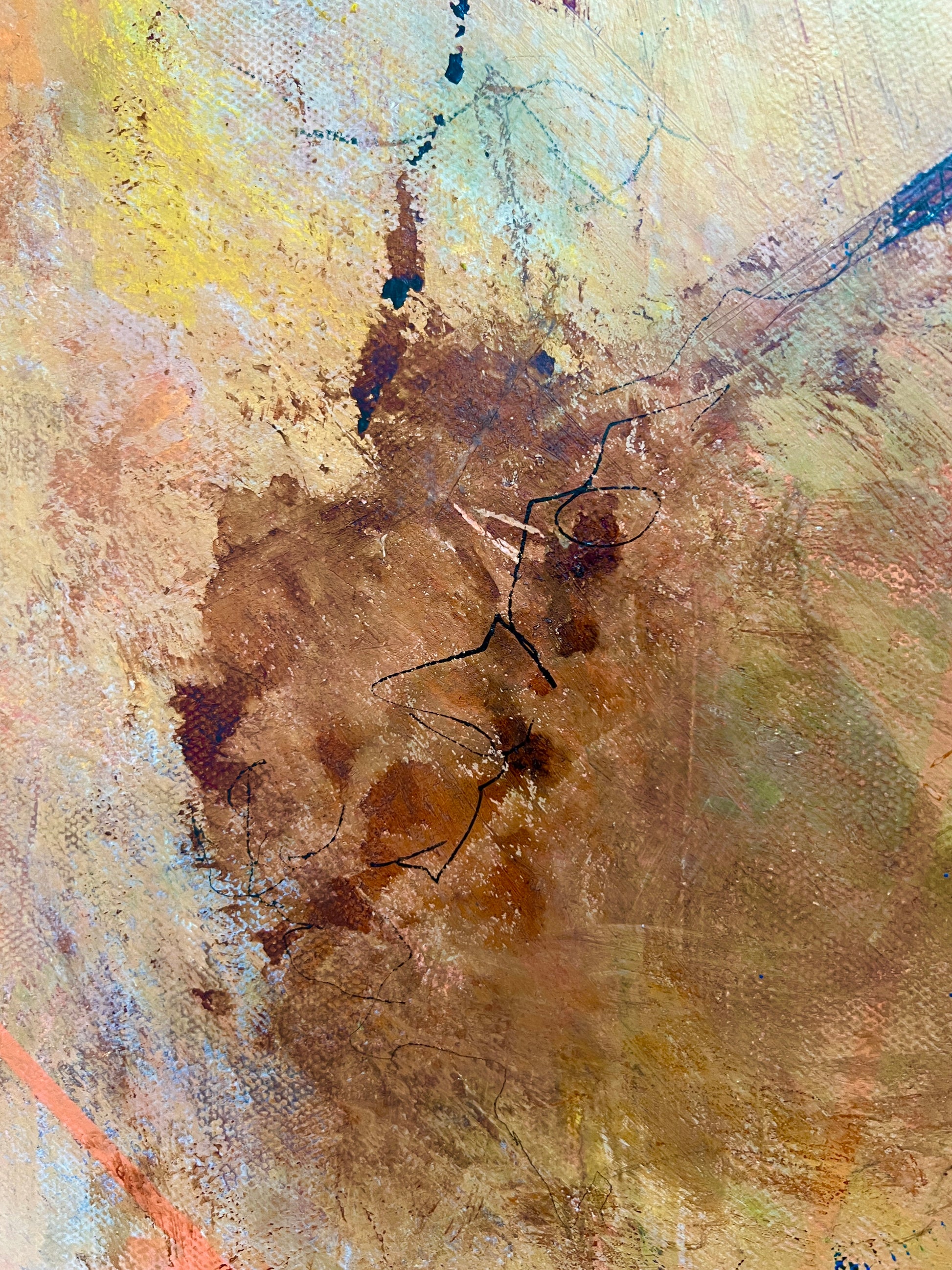 Acrylic paint, ink, paint-laden palette paper, wax pencils, and cold wax.