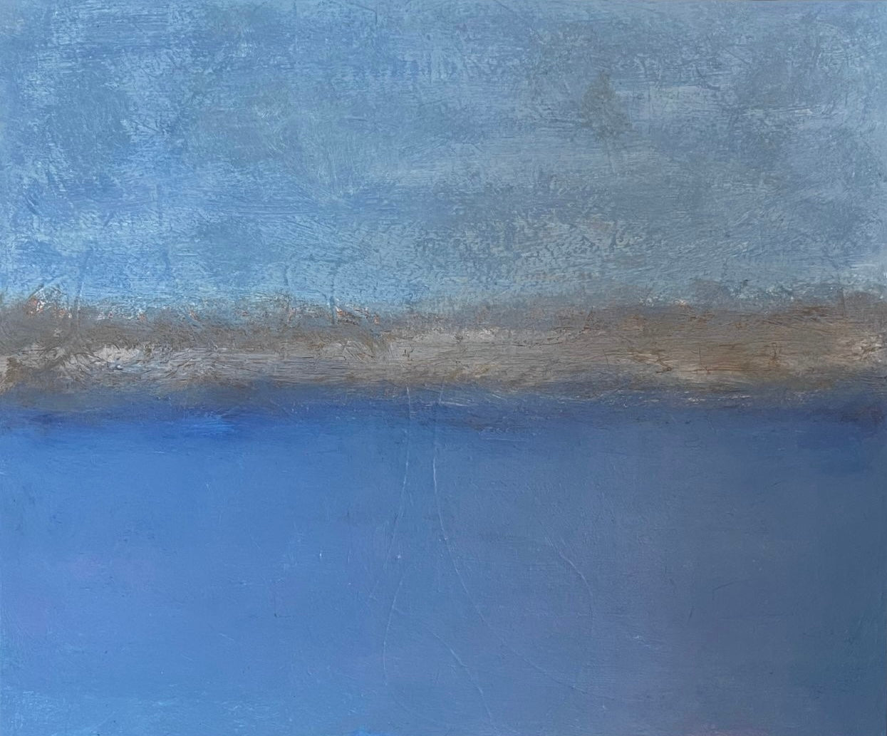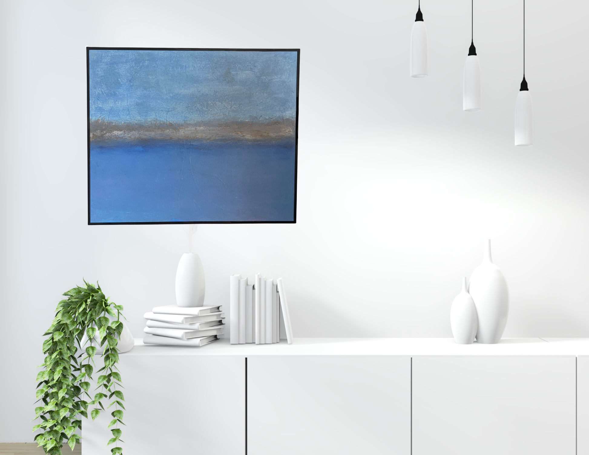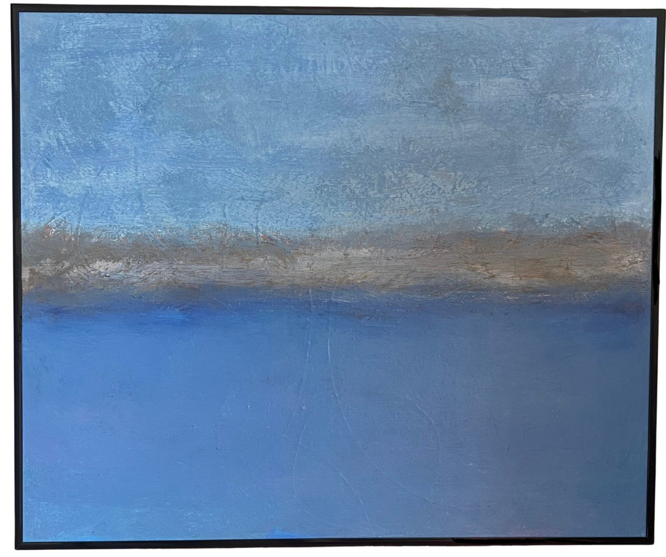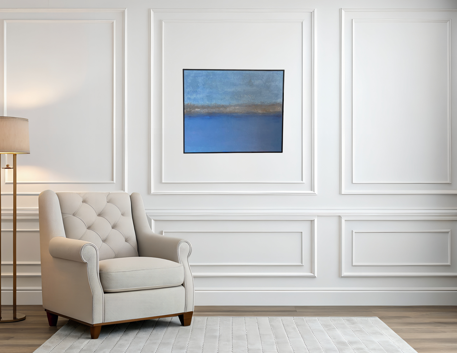 The Great Divide is an abstract landscape exploring the meeting points between sky, land, and water. Layers of blue shift and blend across soft horizon lines, evoking both separation and connection. With its ethereal atmosphere, the painting reflects the harmony that exists within nature’s boundaries.